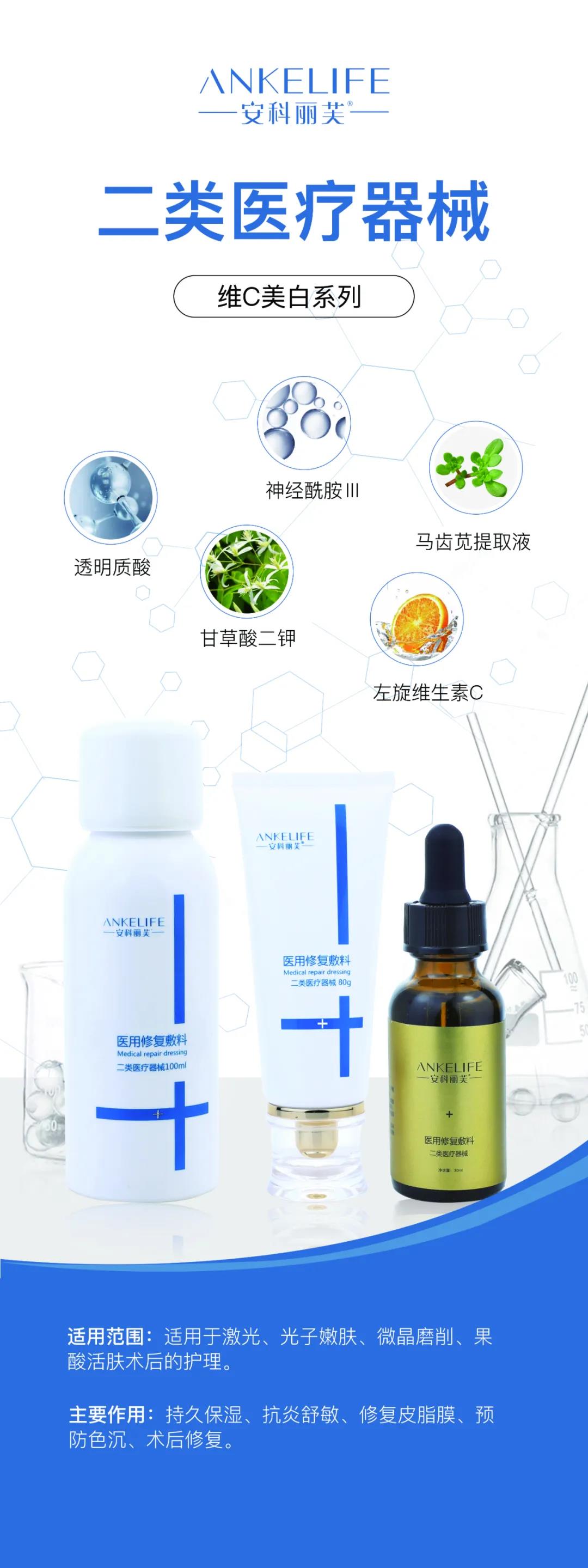 打完水光針后,可以借助安科麗的二類醫(yī)用修復(fù)敷料幫助修復(fù)皮膚屏障功能,搭配VC噴霧,VC精華,VC乳液一起使用,促進(jìn)微創(chuàng)傷口愈合,使水光針的效果維持更久,皮膚術(shù)后更舒適。