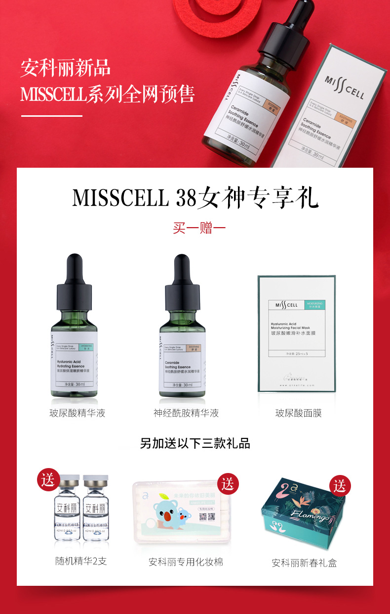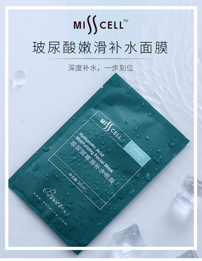 MISSCELL選用優質玻尿酸大小分子相結合的精粹成分,大分子玻尿酸表層保濕鎖水,小分子玻尿酸滲透潤顏,大小分子相結合雙重補水。