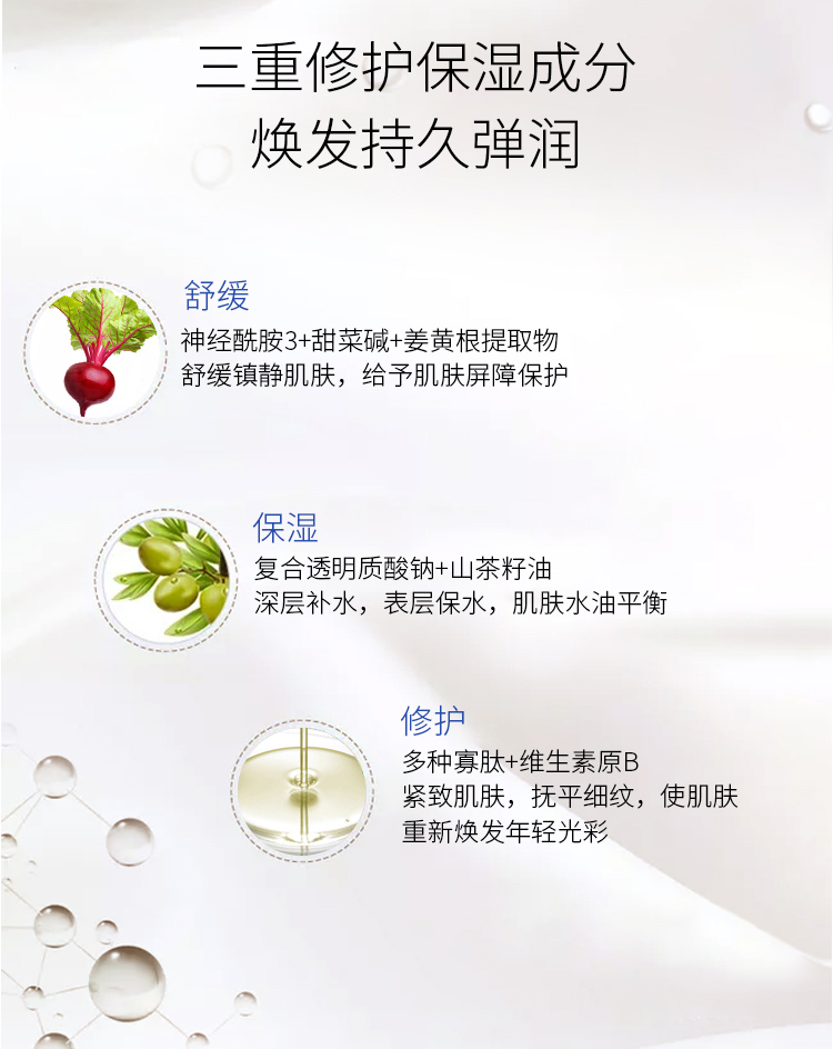 ★修護(hù)肌底:多種活性成分,深入肌底修護(hù)受損細(xì)胞,促進(jìn)彈性纖維,膠原蛋白合成,賦活肌膚年輕彈性。