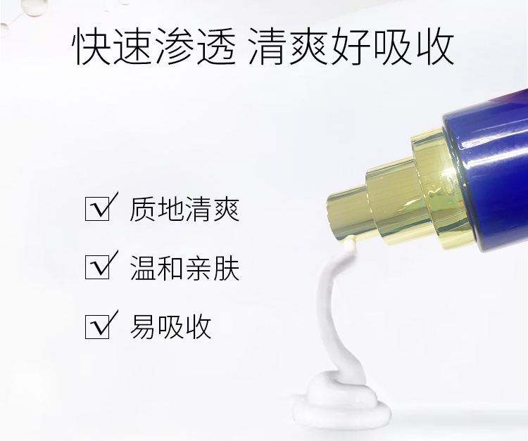 白色乳液狀,清透易涂抹,延展性好,無(wú)粘膩感,水潤(rùn)清爽,無(wú)色素?zé)o香精。
