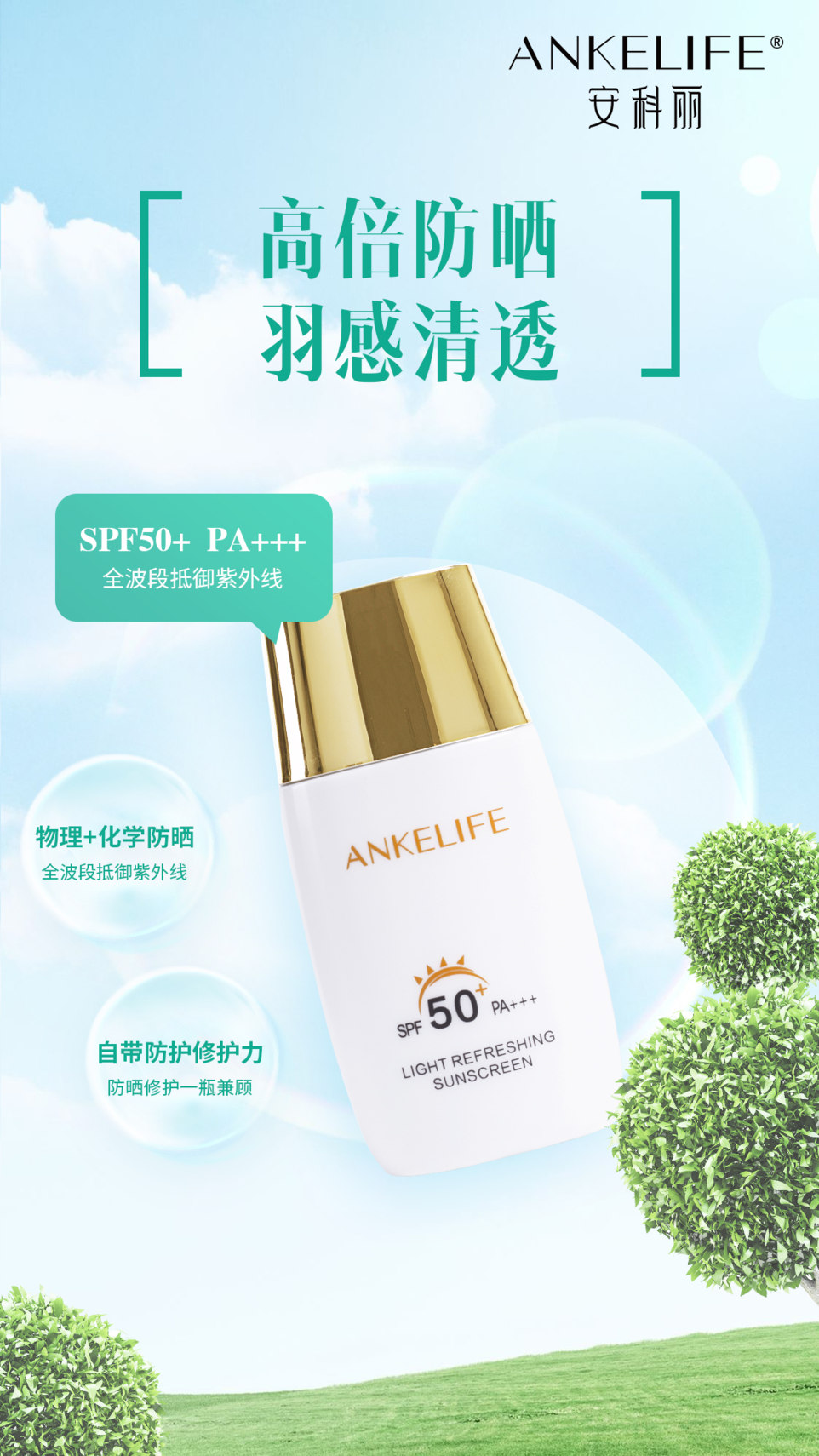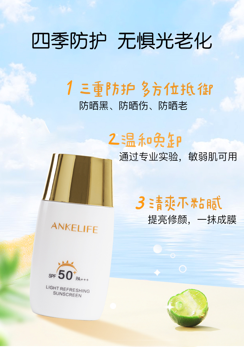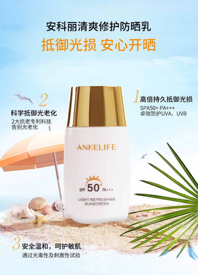 所以基于以上問(wèn)題,在解決懶惰的同時(shí),一定要擁有一款清爽、高倍、不假白、還能抗光老的防曬霜——安科麗清爽修護(hù)防曬乳。